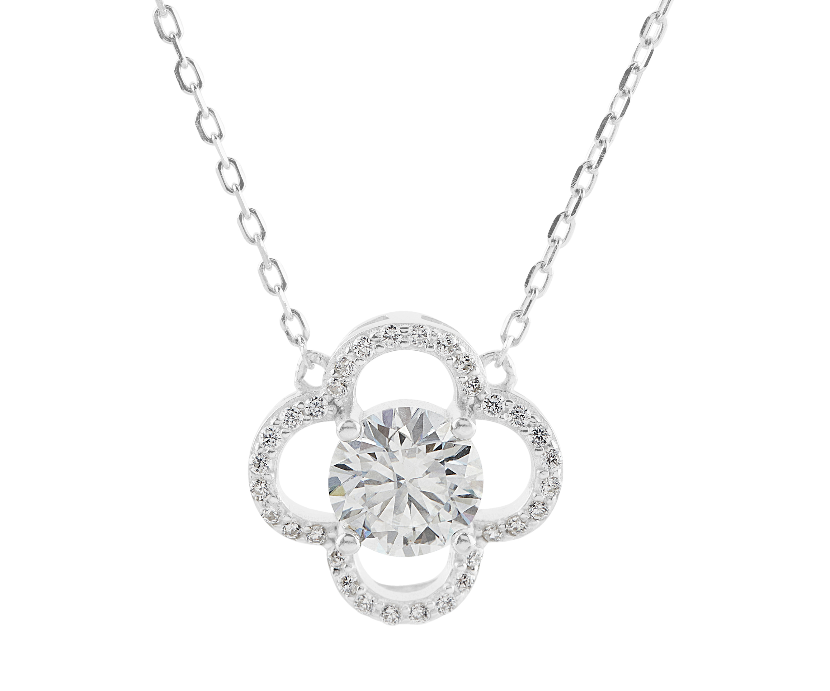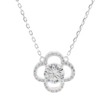 Artfully designed to resemble the delicate petals of a blossoming flower, the Floral Moissanite Pendant showcases a 1-carat round white moissanite gemstone at its heart, encircled by a charming flower petal motif. The necklace, crafted from sterling silver, boasts petite white stones adorning the curves of the petals.