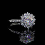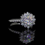 Exquisitely designed, this floral moissanite stone ring showcases a magnificent 1-carat round moissanite gemstone, artfully encircled by an intricate geometric floral motif set in sterling silver, adorned with pristine white stones.