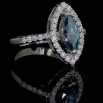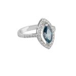 Artfully fashioned from sterling silver, this ring boasts a marquise-cut moissanite gemstone in a delicate shade of blue, enveloped by smaller, pristine stones that elegantly accentuate the entire ring. Additional gemstones grace the band, enhancing its overall allure.