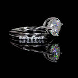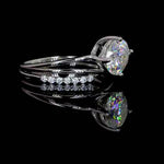This statement ring showcases a striking round-cut white moissanite at its center. With a double band design that accentuates meticulous attention to detail, its stylized sterling silver composition makes it a versatile choice suitable for both daily wear and special occasions.