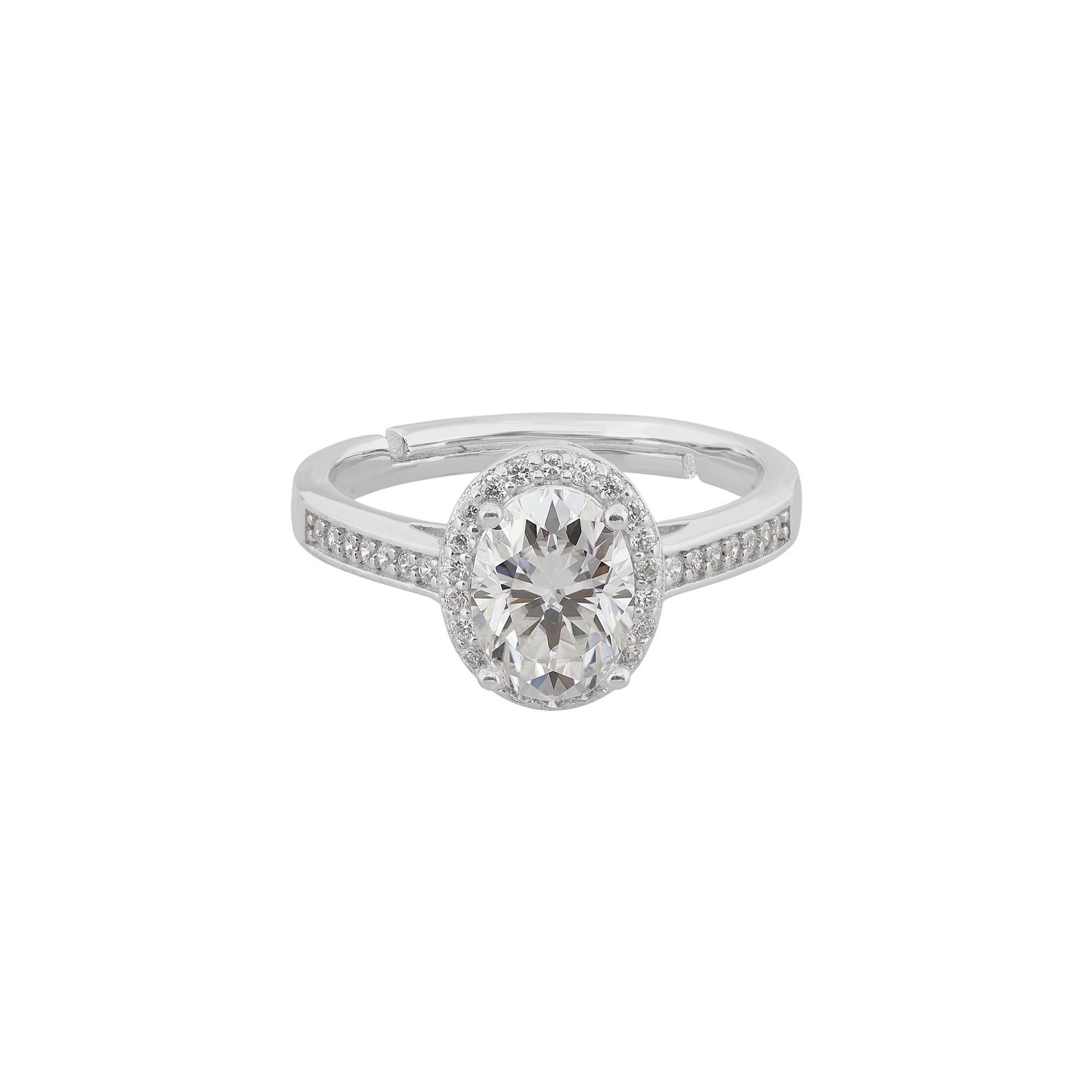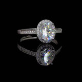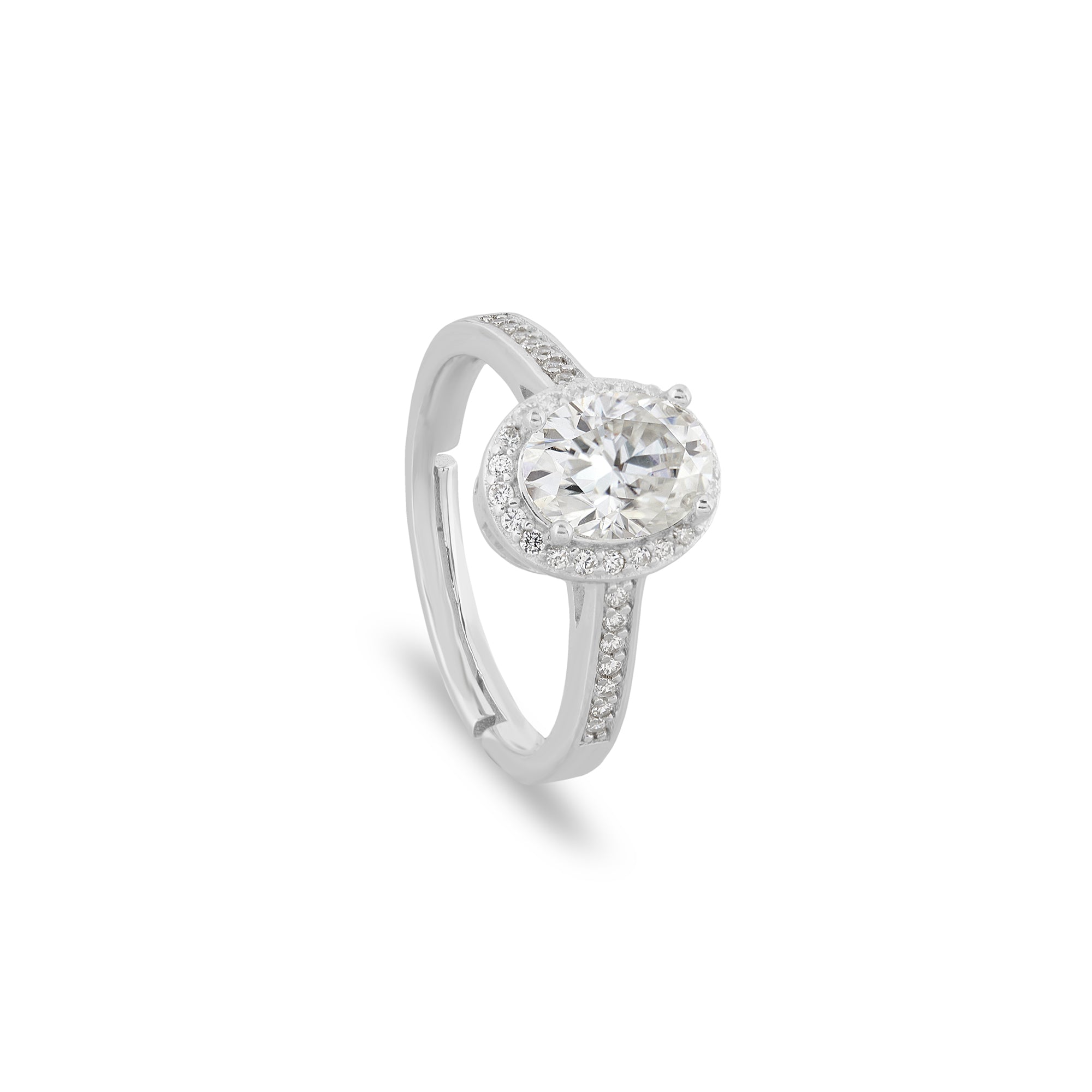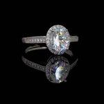 Artisanally crafted from sterling silver, the Solitaire Moissanite Engagement Ring proudly highlights an oval-cut moissanite gemstone, elegantly encircled by smaller gemstones that gracefully adorn the central stone and are meticulously engraved on the band. This ring is a timeless choice, not only serving as an exquisite engagement ring but also as a versatile and enduring statement piece.